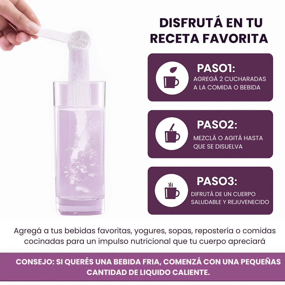 Disolvé 1 o 2 cucharadas al día en tu bebida favorita: café, licuado, yogur o agua. Se puede usar en frío o caliente.